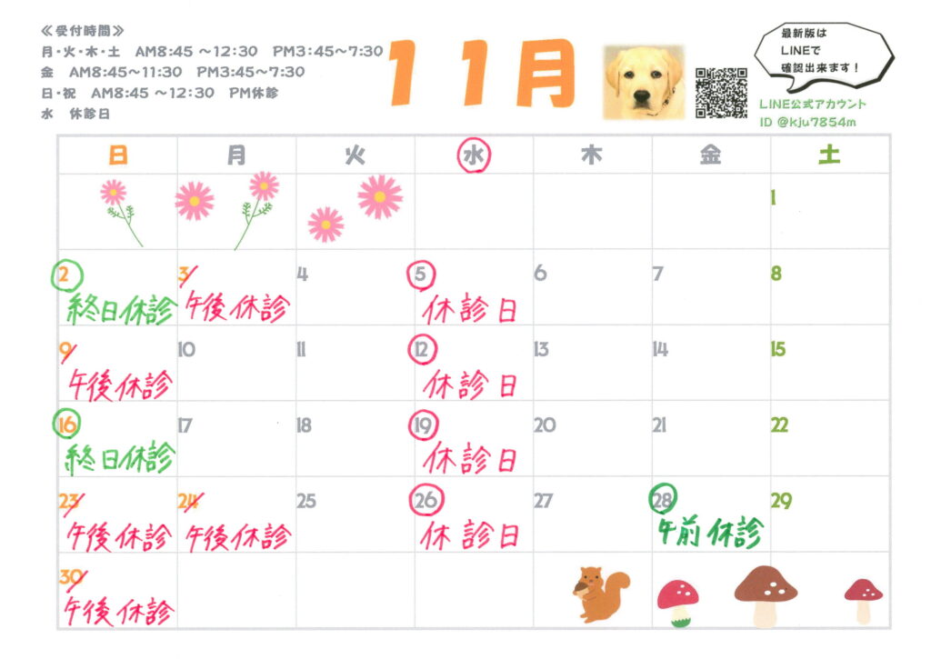 11月の診療時間変更のカレンダーです。